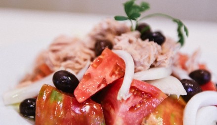Olivas, espárragos, atún, cebolla, huevo, lechuga y tomate