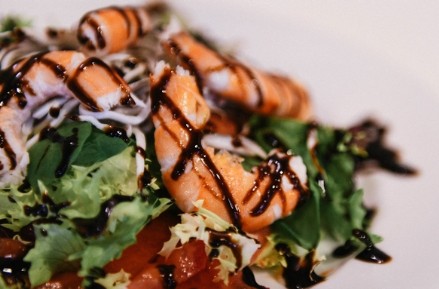 Queso de cabra, gambas, tomate cherry, picatostes, frutos secos y vinagre de Módena