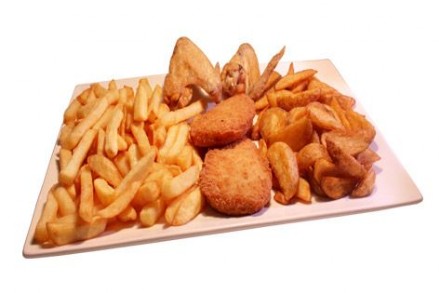 1 croqueta, 3 alitas de pollo, 3 nuggets, patatas fritas y tarrina de helado o granizado